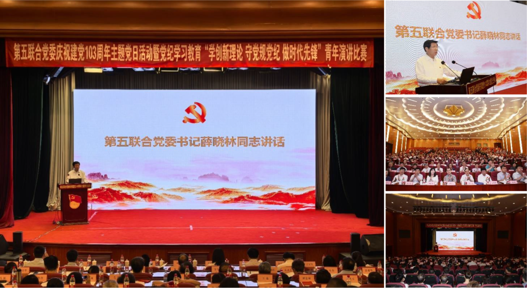 第五联合党委书记薛晓林同志讲话时指出:党的生日是党员同志们的共同节日,也是回顾过去,展望未来的重要时刻。在庆祝中国共产党成立103周年之际组织主题党日活动和青年演讲比赛,是继承和发扬党的光荣传统和优良作风的实际行动,是引导广大党员自觉用党规党纪校正思想和行动,以实际行动践行党的宗旨的有力举措。全体党员要铭记党的初心和使命,永葆共产党员的政治本色,自觉地为新时代党的历史使命而努力奋斗;要坚定理想信念,时刻保持政治上的坚定性、思想上的纯洁性,行为上的先进性,做到对党绝对忠诚;要不断强化党的纪律意识,知敬畏,存戒惧,守底线,切实发挥好党组织的战斗堡垒作用、党员的先锋模范作用;要锤炼党的执政能力,切实增强“四个意识”,坚定“四个自信”,做到“两个维护”,为社会组织高质量发展提供坚强保障。